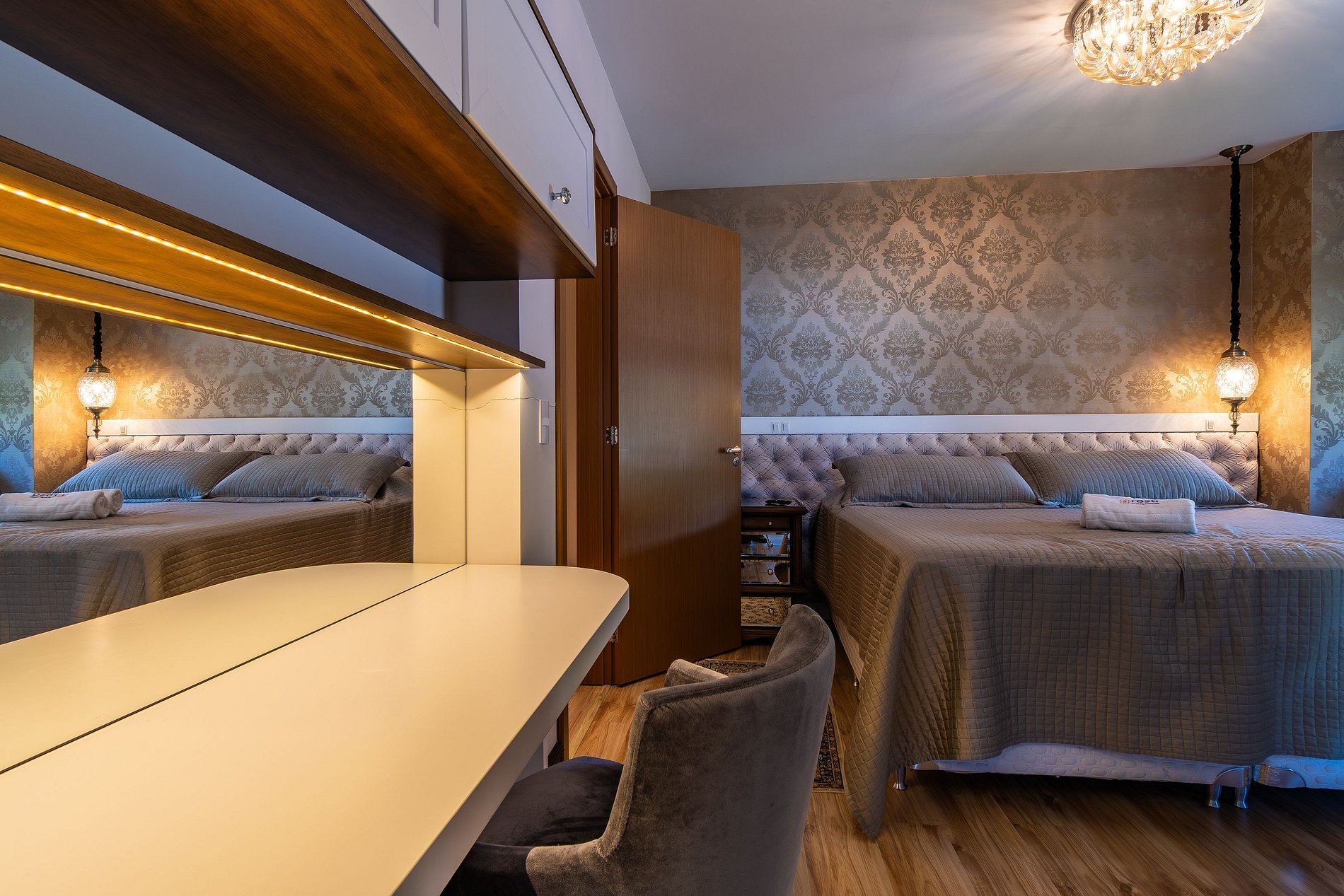 3️⃣Suíte com 2 camas solteiro + 1 cama auxiliar ( podendo juntar e ficar king como nas fotos)